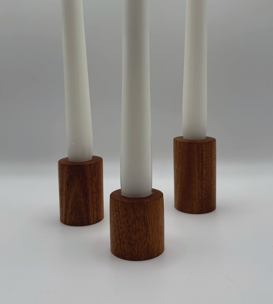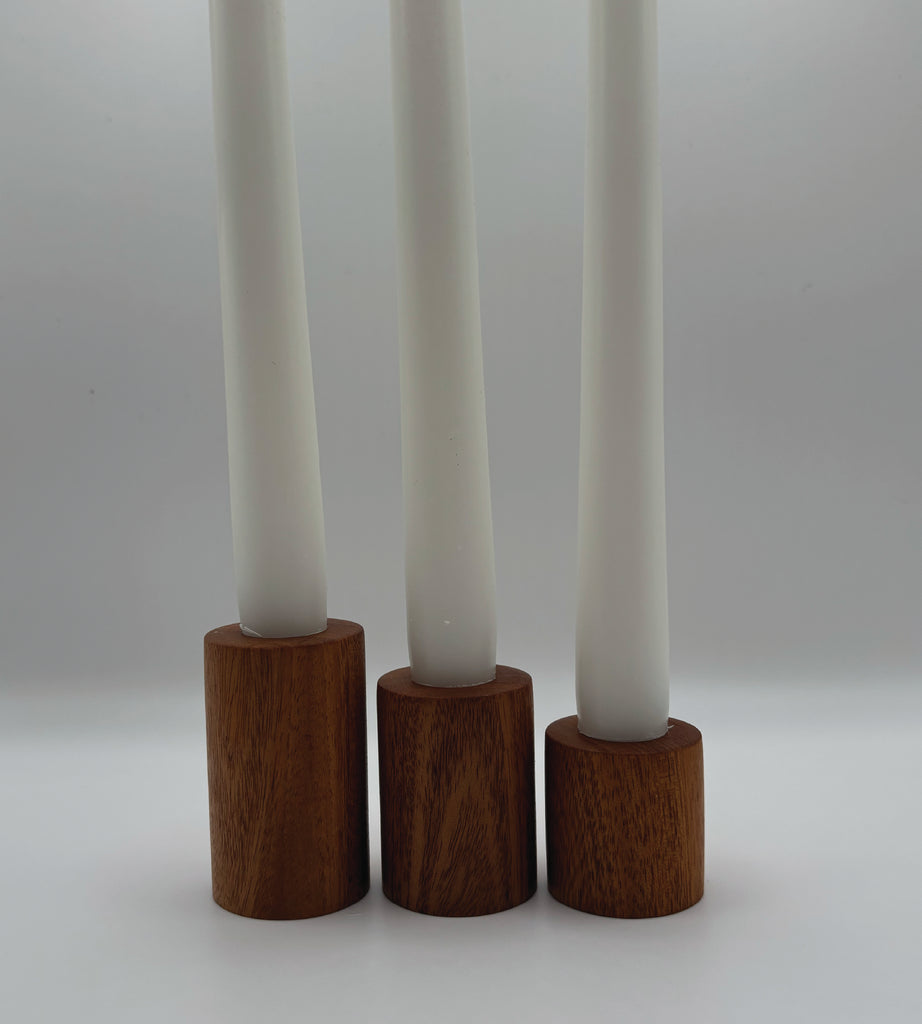 Create a warm and inviting atmosphere in your home with this set of three mahogany taper candle holders. Crafted from rich mahogany wood, these candle holders are as elegant as they are versatile. The set includes three different sizes, perfect for creating a dynamic display on your dining table, mantle, or side table. The classic design and smooth finish make these candle holders a timeless addition to any decor style. Whether you're hosting a dinner party or enjoying a quiet evening at home, these mahogany taper candle holders will add a touch of sophistication to your space.